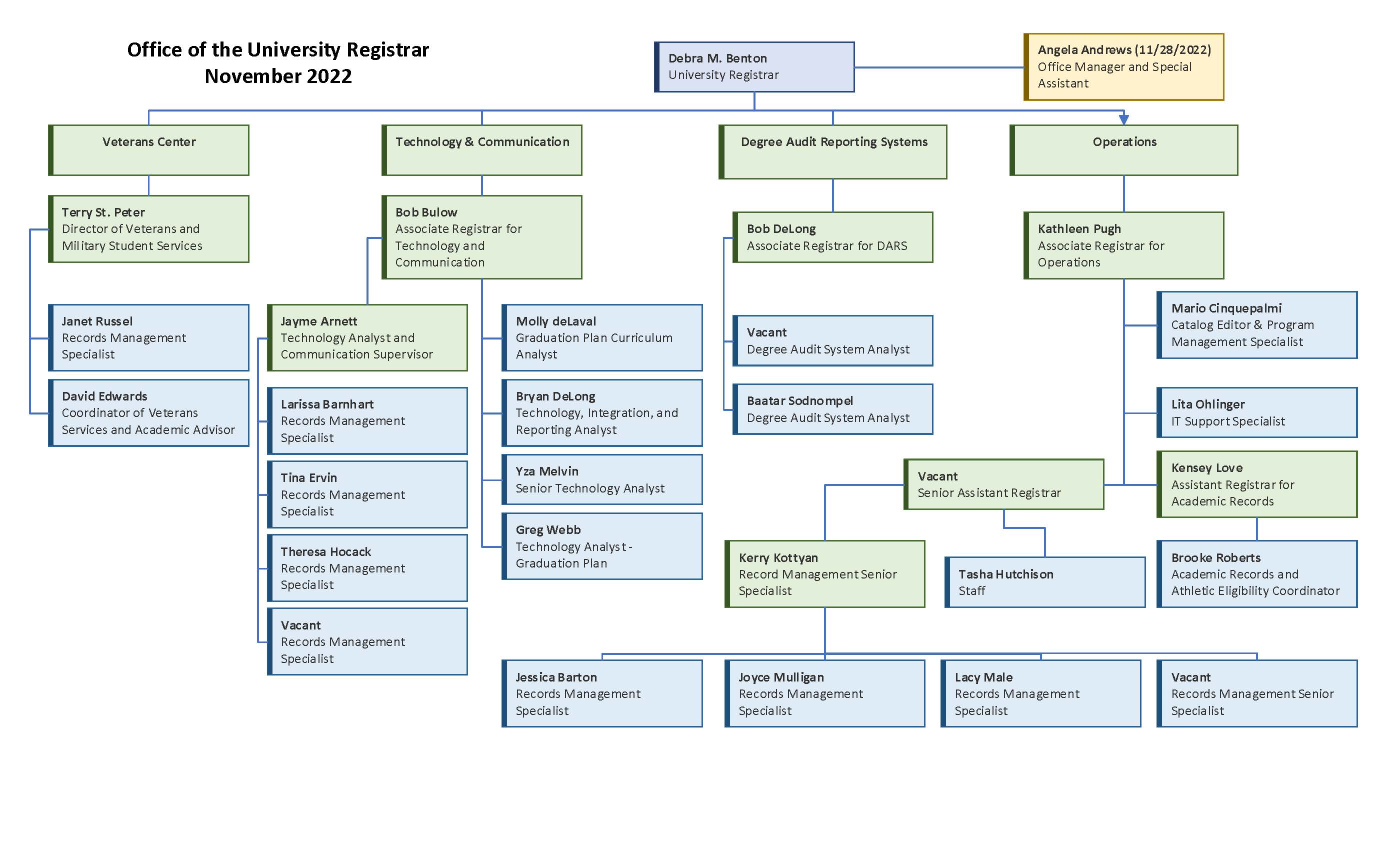 The Office of the University Registrar consists of 28 employees: 18 administrative and 10 classified bargaining unit staff, plus numerous student employees working in five distinct units (Administration; Degree Audit; Operations, which includes Academic Records, Ad-Hoc Reporting, Catalog Production and Program Management, and Registrar Services; Technology and Communication; and Veterans Center). The Office of the University Registrar reports to the Vice President for Enrollment Management.