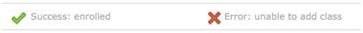 For each class, you will see a status message that indicates if you successfully added or if there is an error. A green checkmark indicates "Success: enrolled." A red X indicates "Error: unable to add class."