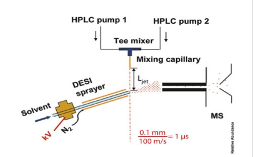 At this time the predominant method for a pharmaceutical chemist to characterize reaction kinetics is to employ spectroscopy. The main issue with this technique is that spectroscopy produces an absorption/Emission spectrum and it is possible for multiple different compounds to have the same spectrum peak, making it difficult to differentiate. Microsecond Time-Resolved Mass-Spectrometry was developed to collect high time resolution and chemical specificity for analysis of biochemical reactions. A T-mixer allows two separate chemicals in solution to be mixed together to form a free high-speed jet stream. Along the liquid jet, DESI spray ionizes the stream and the resulting ions are then monitored by the MS. The distance the jet travels is indicative of reaction time, so this technology is capable of collecting mass spectra at different time points in the reaction.