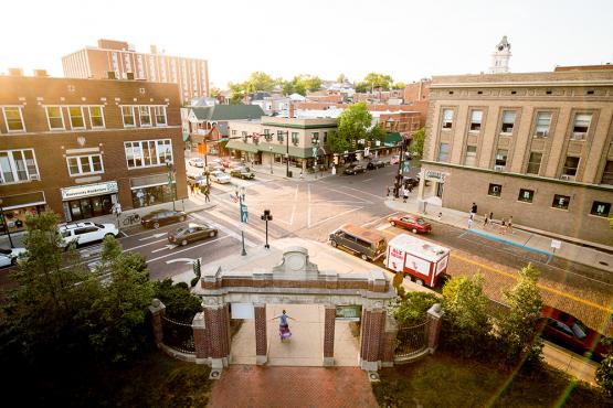 aerial view of College Gate and Court Street with 'No One Simply passes through here. written on the image