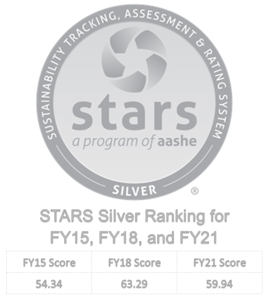 The 2017 Administrative Support infographic outlining progress towards the 2011 sustainability benchmarks and new goals set for fiscal year 2026. AASHE STARS Gold is a rating from the Association for the Advancement of Sustainability in Higher Education (AASHE) Sustainability Tracking Assessment and Rating System(STARS). Gold is the second highest rating; as of 2019 only 4 institutions have the highest rating, Platinum. Click the tabs below to learn more!