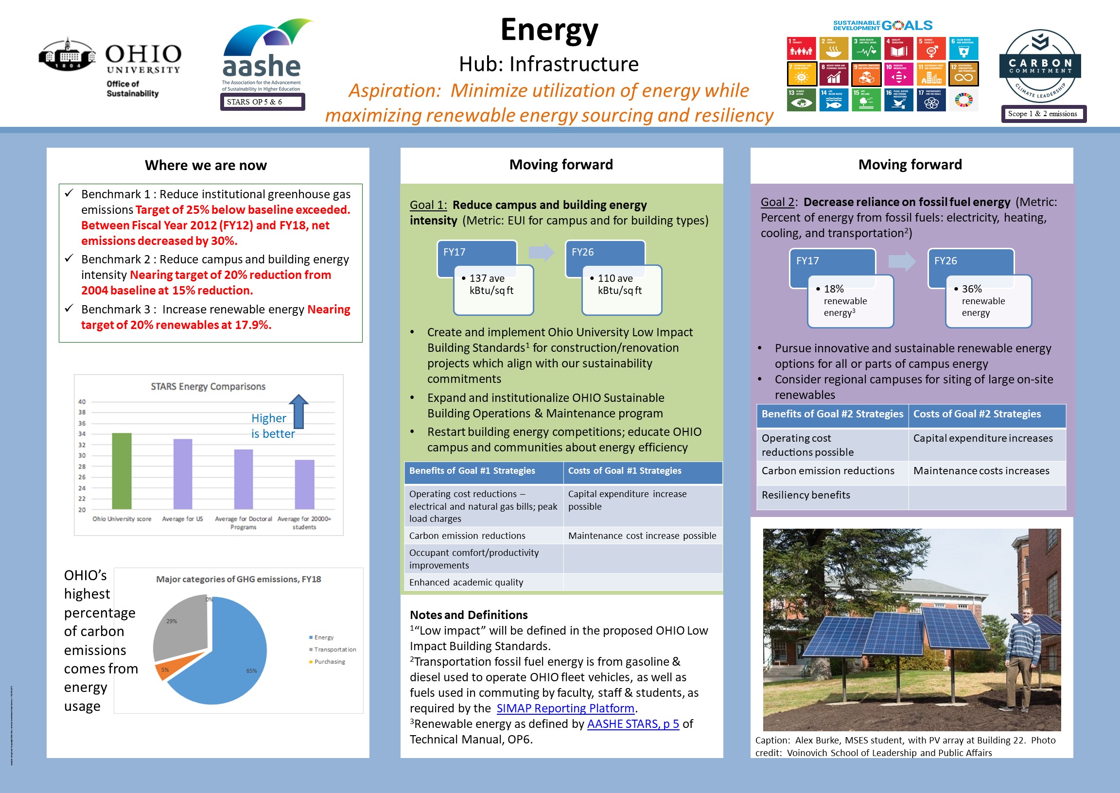 Goal 2:  Decrease reliance on fossil fuel energy, hereby increasing the percent of renewable energy (defined by AASHE STARS, p 5 of Technical Manual, OP6) in electricity, cooling, heating, and transportation (including, but not limited to, gasoline & diesel used to operate OHIO fleet vehicles, as well as fuels used in commuting by faculty, staff & students, as required by the SIMAP Reporting Platform from 18% to 36%