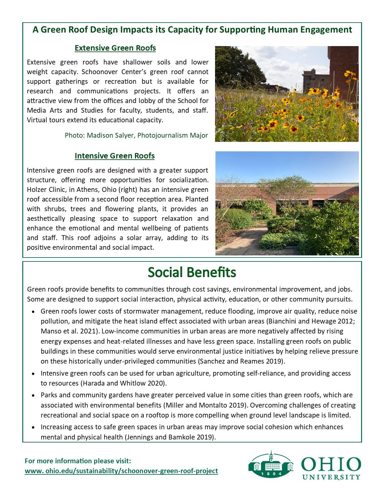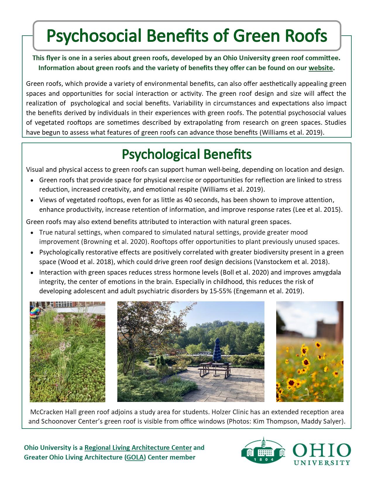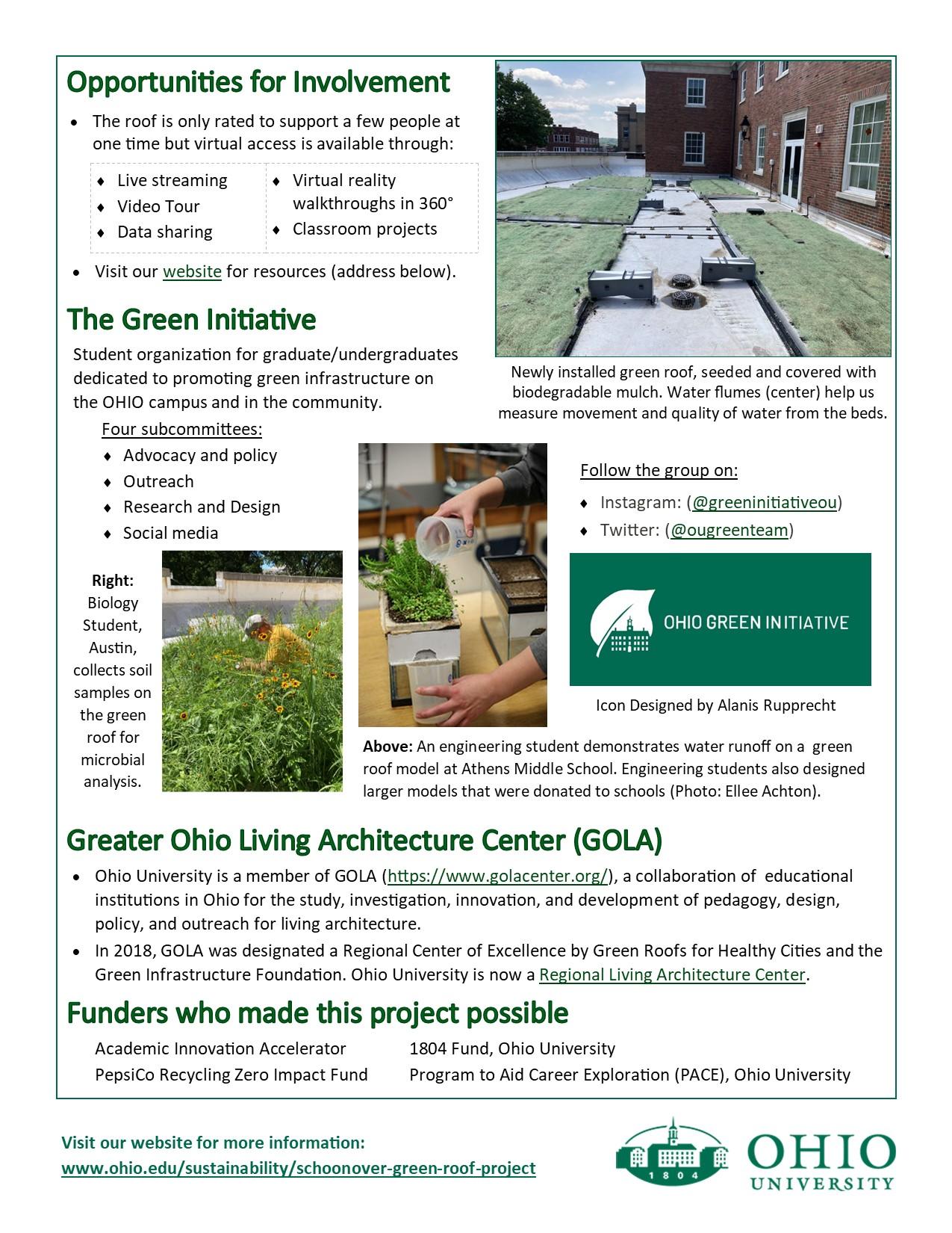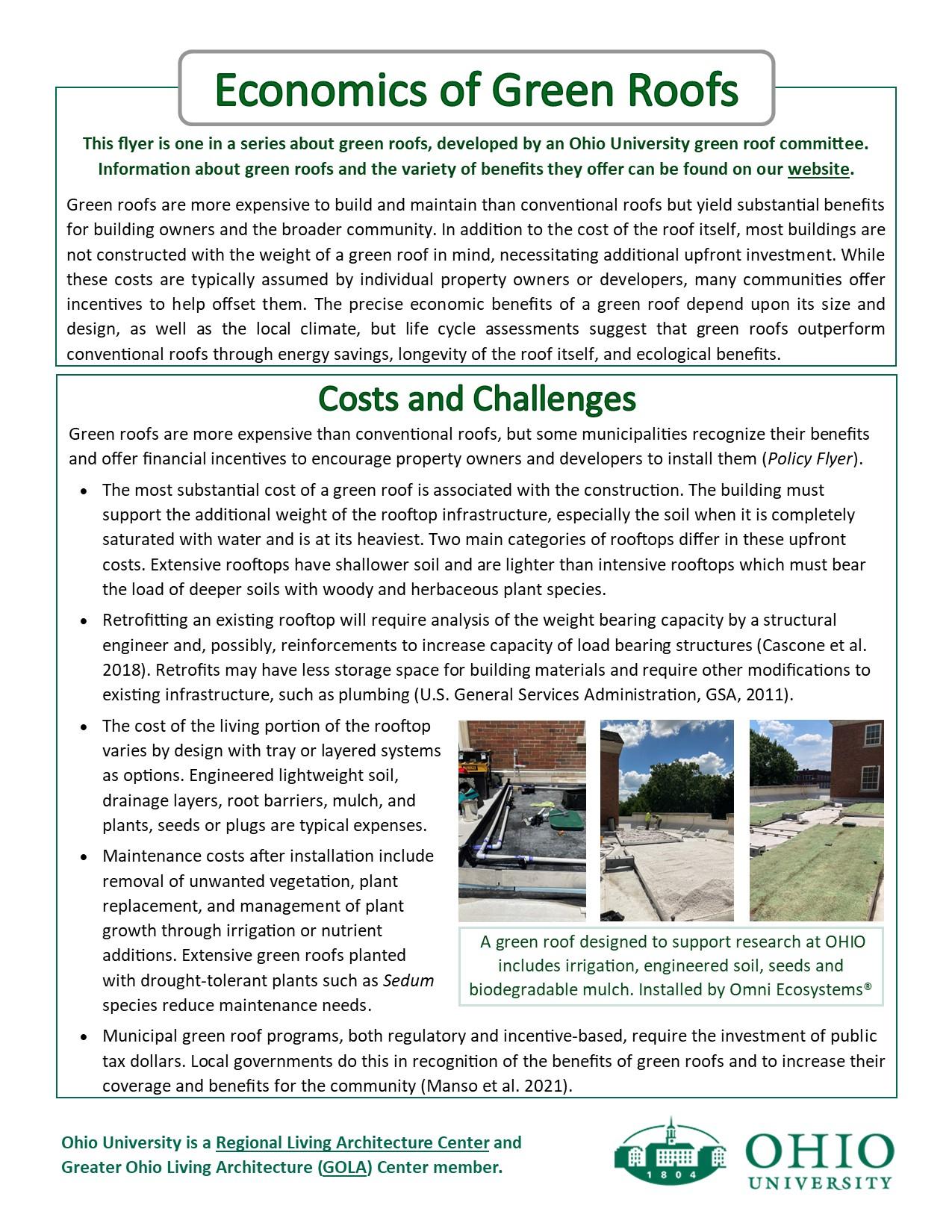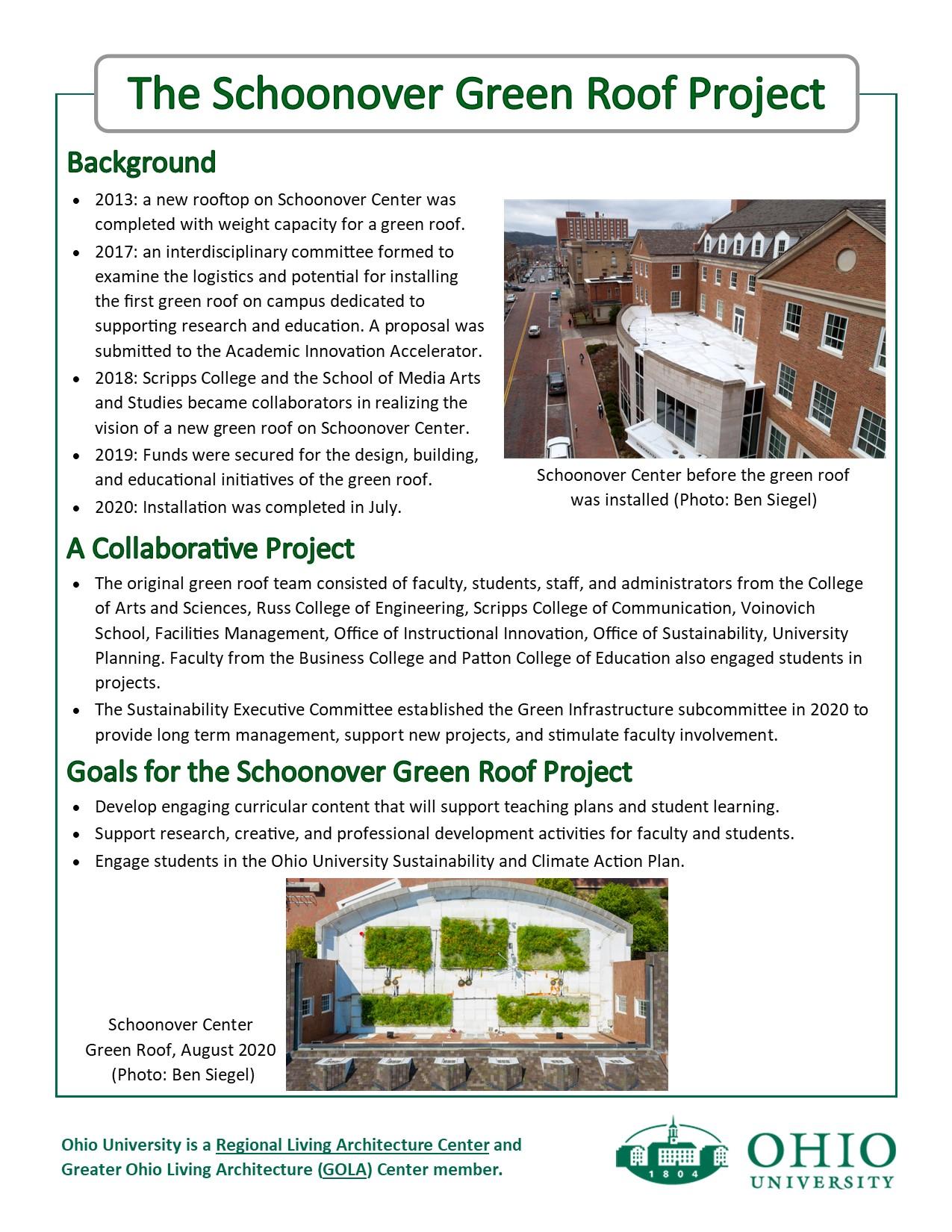 A series of information flyers are available here to help you learn about green roofs. Learn about their benefits, technology that can be used in research studies on a green roof, the economic costs and benefits, impact on psychosocial aspects of health, policies related to green infrastructure, and the Schoonover green project at Ohio University. We intend for these to be useful in a classroom setting so chose those that best meet your objectives for your classroom or enjoy learning about green roofs for yourself.