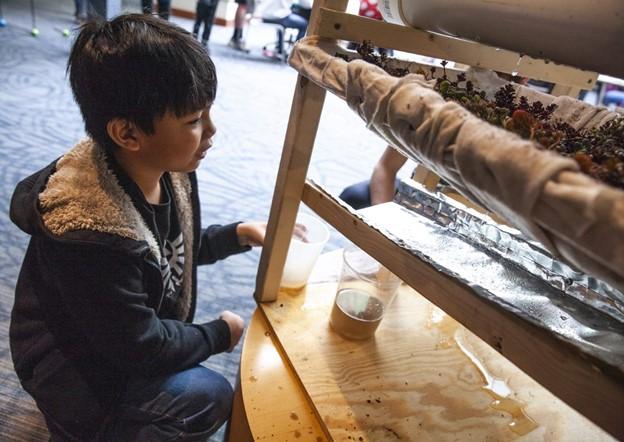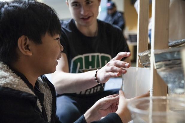 Jesse Jarrold-Grapes in an undergraduate photojournalism major in Scripps College. He attended a STEM fair for young people at the Russ College of Engineering on campus where University students involved with the green roof project used a roofing model to demonstrate the benefits of a green roof over a traditional roof. In these photos, elementary school students measure the water running off the traditional roof side of the model so that they can compare it to the water runoff on the green roof side. See our Engineering page for more information about the large models that were designed by students and donated to local schools.