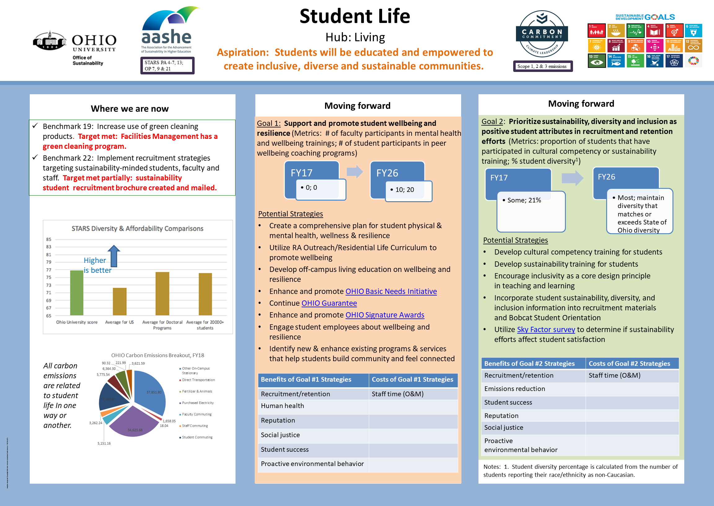 Our goal is to improve the quality of life for our students, both now and in the future, while also enhancing their economic prosperity and reducing their carbon footprint. To achieve this, we have put in place initiatives that focus on wellness, diversity, inclusion, affordability, and accessibility.