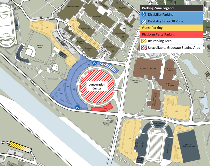 Disability Parking & Disability Drop Off: A designated drop off zone is accessible via West Green Drive to accommodate loading/unloading needs. Disability parking will be available at the Convocation Center (See map below).