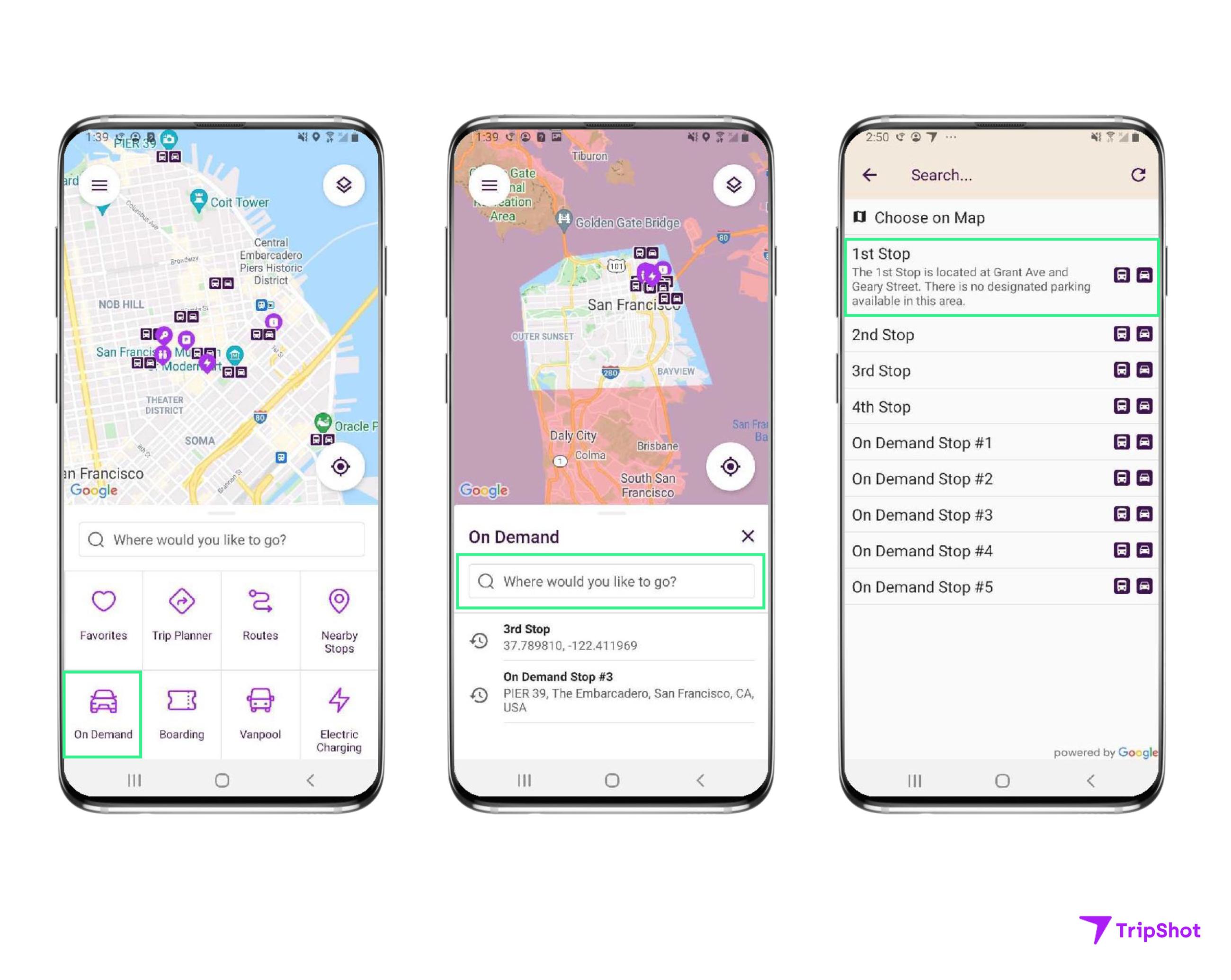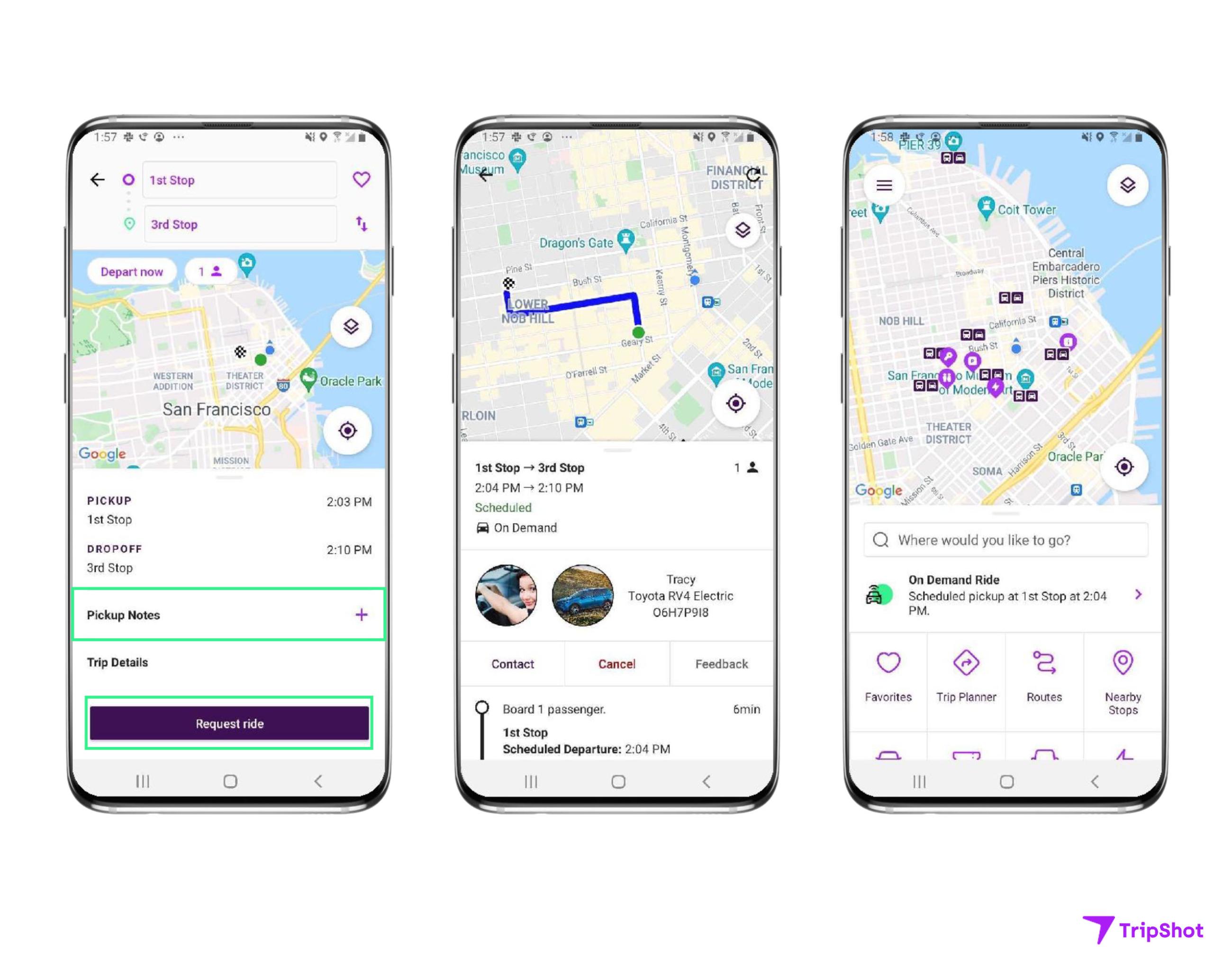 Riders are encouraged to schedule rides in advance by downloading the TripShot App. Requests for on-demand service are also accepted — wait times are dependent on demand and load at time of reservation request and cannot be guaranteed.